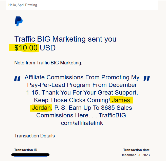 Here’s a screenshot of a payment I received from James Jordan, promoting this program: